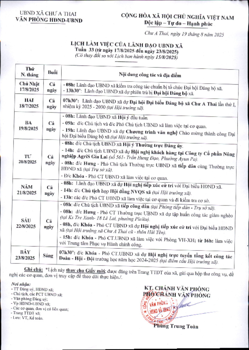Lịch làm việc của Lãnh đạo UBND xã Tuần 33 13/08/2025, 15:59:40 - Lượt xem: 2 Tweet Thêm vào danh sách Báo xấu Thông tin tài liệu Lịch làm việc của Lãnh đạo UBND xã Tuần 33
