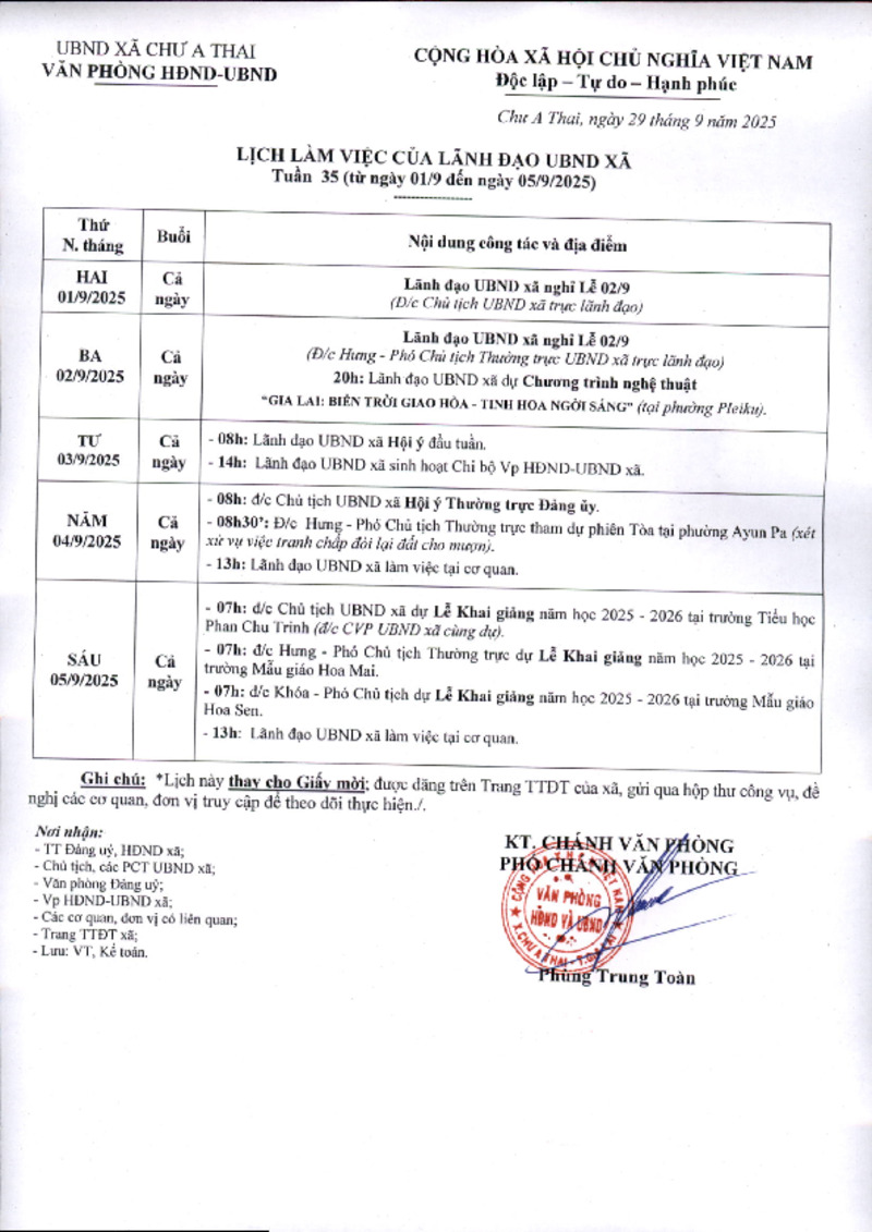 Lịch làm việc của Lãnh đạo UBND xã Tuần 35 03/09/2025, 21:28:24 - Lượt xem: 6 Tweet Thêm vào danh sách Báo xấu Thông tin tài liệu Lịch làm việc của Lãnh đạo UBND xã Tuần 35