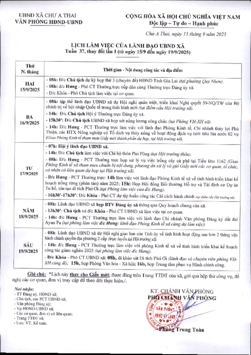Lịch làm việc của Lãnh đạo UBND xã Tuần 37 16/09/2025, 11:09:21 - Lượt xem: 3 Tweet Thêm vào danh sách Báo xấu Thông tin tài liệu Lịch làm việc của Lãnh đạo UBND xã Tuần 37