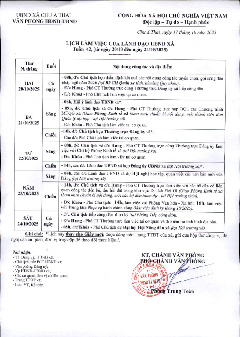 Lịch làm việc của Lãnh đạo UBND xã Tuần 42 17/10/2025, 21:04:53 - Lượt xem: 5 Tweet Thêm vào danh sách Báo xấu Thông tin tài liệu Lịch làm việc của Lãnh đạo UBND xã Tuần 42