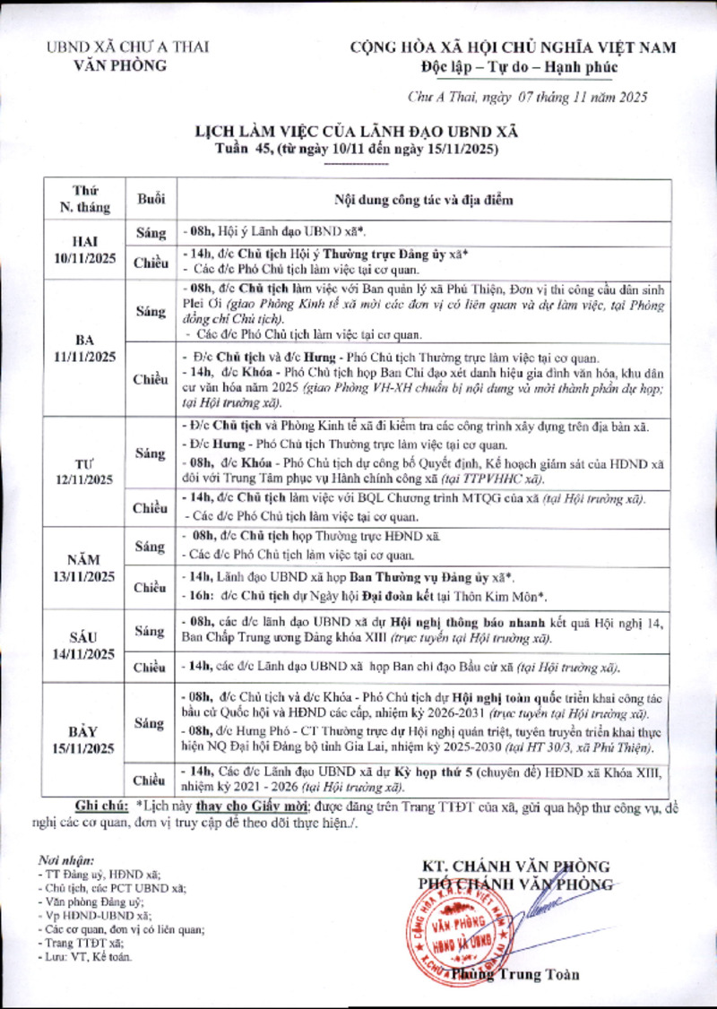 Lịch làm việc của Lãnh đạo UBND xã Tuần 45 04/11/2025, 09:22:35 - Lượt xem: 0 Tweet Thêm vào danh sách Báo xấu Thông tin tài liệu Lịch làm việc của Lãnh đạo UBND xã Tuần 45