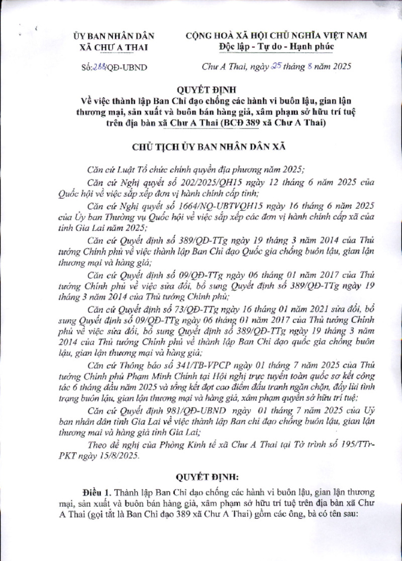 Số hiệu | 288/QĐ-UBND | Cơ quan ban hành | UBND xã Chư A Thai |