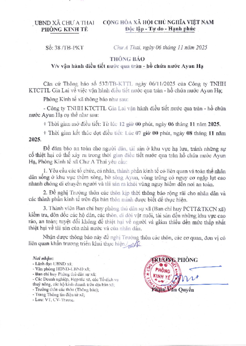 | Tiêu đề văn bản | Thông báo điều tiết xả lũ hồ chứa nước Ayun Hạ ngày 06/11/2025 | ||