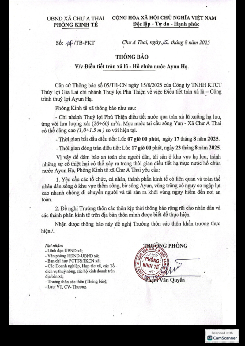 Tiêu đề văn bản | Thông báo xả lũ ngày 17/8/2025. | ||