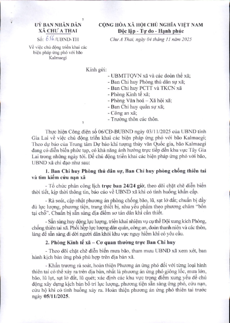 | Tiêu đề văn bản | Về việc chủ động triển khai các biện pháp ứng phó với bão Kalmaegi | ||