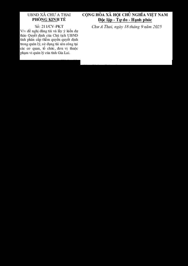 Thực hiện Công văn số 2524/STC-QLGCS ngày 16/9/2025 của Sở Tài chính tỉnh Gia Lai về việc lấy ý kiến dự thảo Quyết định của Chủ tịch Ủy ban nhân dân tỉnh phân cấp thẩm quyền quyết định trong quản lý, sử dụng tài sản công tại các cơ quan, tổ chức, đơn vị thuộc phạm vi quản lý của tỉnh Gia Lai. Để có cơ sở tổng hợp, tham mưu Ủy ban nhân dân xã báo cáo Sở Tài chính tỉnh.