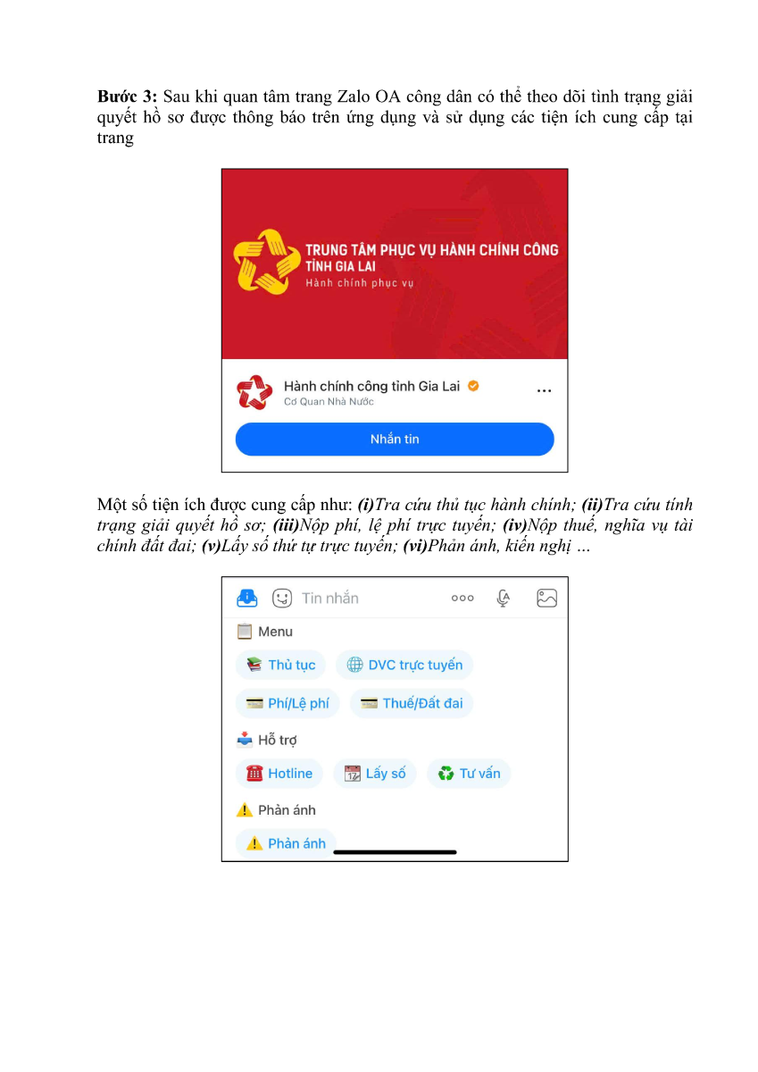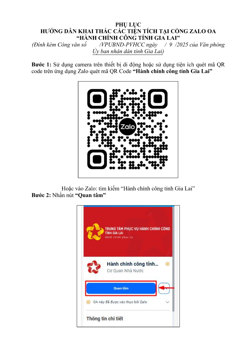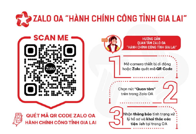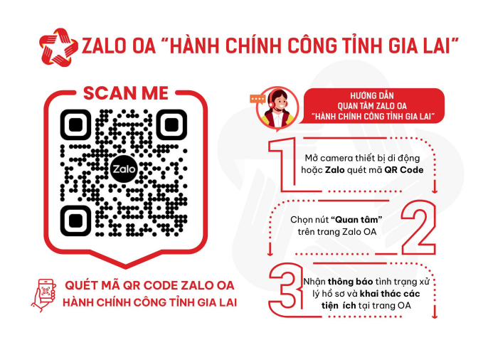 Vì vậy người dân, doanh nghiệp khi liên hệ thực hiện thủ tục hành chính chủ động quét mã QR và quan tâm Cổng Zalo OA “Hành chính công tỉnh Gia Lai” để được nhận tất cả thông tin liên quan đến quá trình tiếp nhận, giải quyết hồ sơ thủ tục hành chính trên địa bàn tỉnh (kể cả những hồ sơ khác được nộp sau này) và các thông tin hướng dẫn hữu ích khác liên quan đến việc thực hiện thủ tục hành chính trên địa bàn tỉnh.