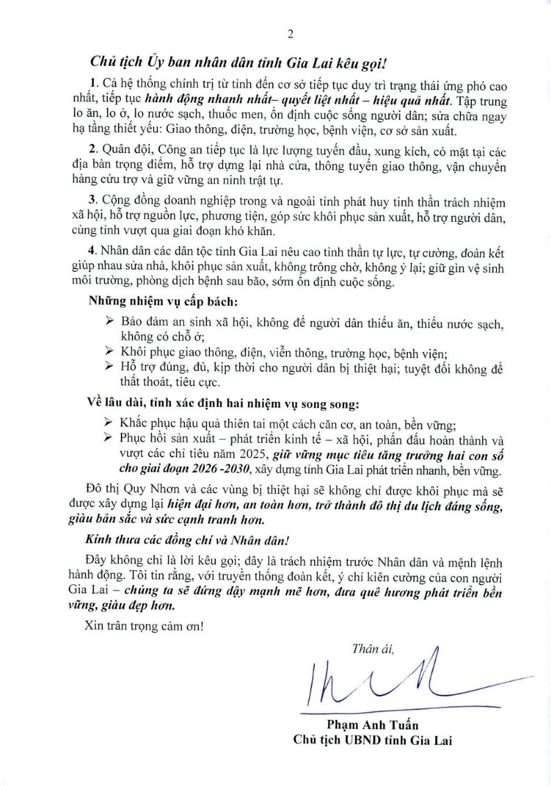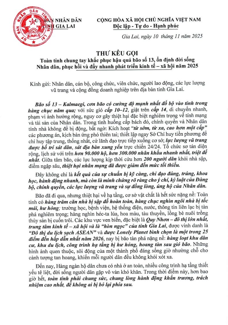 Thư kêu gọi của Chủ tịch UBND tỉnh Gia Lai về khắc phục hậu quả bão số 13, ổn định đời sống Nhân dân, phục hồi và phát triển KT-XH năm 2025.