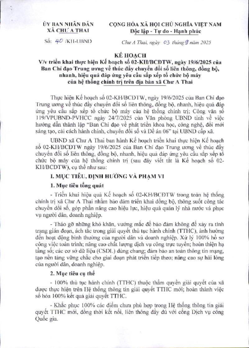 Tiêu đề văn bản | KH triển khai thực hiện Kế hoạch số 02-KH/BCĐTW, ngày 19/6/2025 của Ban Chỉ đạo Trung ương về thúc đẩy chuyển đổi số liên thông, đồng bộ, nhanh, hiệu quả đáp ứng yêu cầu sắp xếp tổ chức bộ máy của hệ thống chính trị trên địa bàn xã Chư A Thai | ||